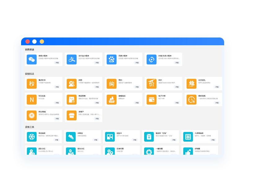 微商城解决方案致力于为零售业提供多渠道电商解决方案,通过自建商城,以及营销系统、分销系统、会员系统帮助企业搭建新一代微商城销售体系,快速实现去中心化流量聚合,客户粉丝沉淀,助力企业快速步入移动电商时代。